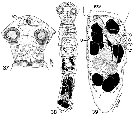 FIGURES 37–39. Healyum pulvis n. sp. 37. Scolex. 38. Whole worm. 39. Mature proglottid. Abbreviations: AO, apical organ; ESV, external seminal vesicle; C, cirrus; CS, cirrus sac; GP, genital pore; U, uterus; VA, vagina.