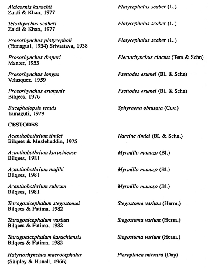 | Scientific Name Notes | This name was used in a list of cestode parasites from marine fishes in Pakistan by Bilqees (1995); Bilqees & Fatima (1982) was given as the authority, however the citation given was incomplete, with a different data (as 1980); reference to this species could not be found in any other publication or database; Bilqees & Fatima (1982) could not be obtained. For nomenclatural purposes, the name does not appear to have been published and is thus a nomen nudum (i.e, unavailable). |