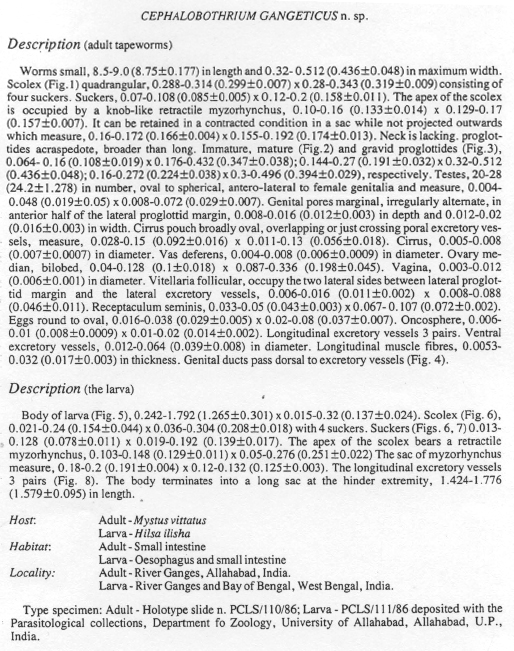| Type Material | Adult Holotype slide n. PCLS/110/86 deposited with the Parasitological collections, Department of Zoology, University of Allahabad, Allahabad, U.P. India. |