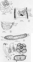 x300; 4. T. S. of a mature proglottid x570. Larvae - 5. W. M. of larva x350; 6, scolex x200; 7. T. S. of scolex x350; 8. T. S. of hinder of body of larva x350. ABBREVIATIONS