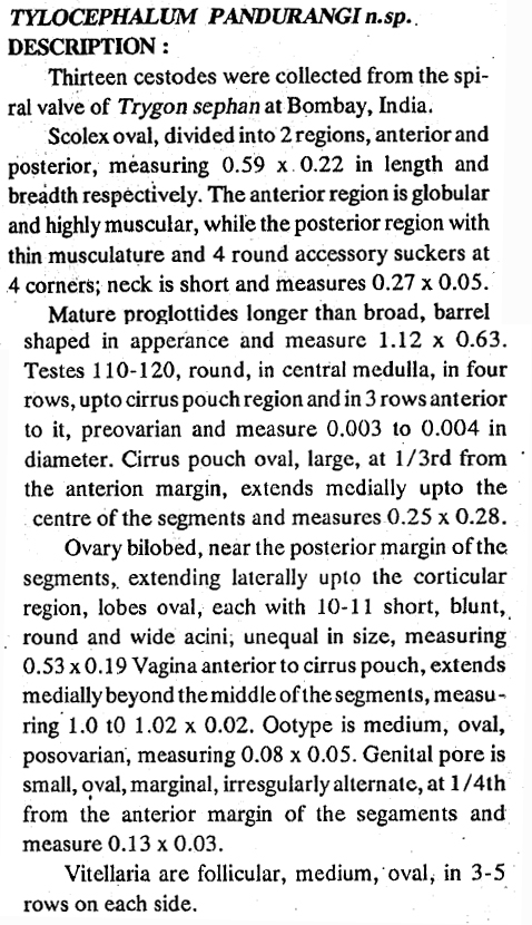 Shinde, S. P. and M. A. Mahajan. 1993-1994. On a new species of Tylocephalum (Cestoda: Lecanicephalidae Braun, 1900) from Trygon sephen at Bombay, India. Dr. Babasaheb Ambedkar Marathwada University Journal of Sciences 27: 61-63. (6650) |