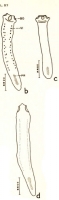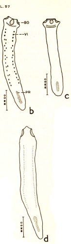 b, c, d. Glaridacris oligorchis n. sp., various views of immature specimens from Catostomus tahoensis.