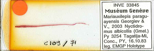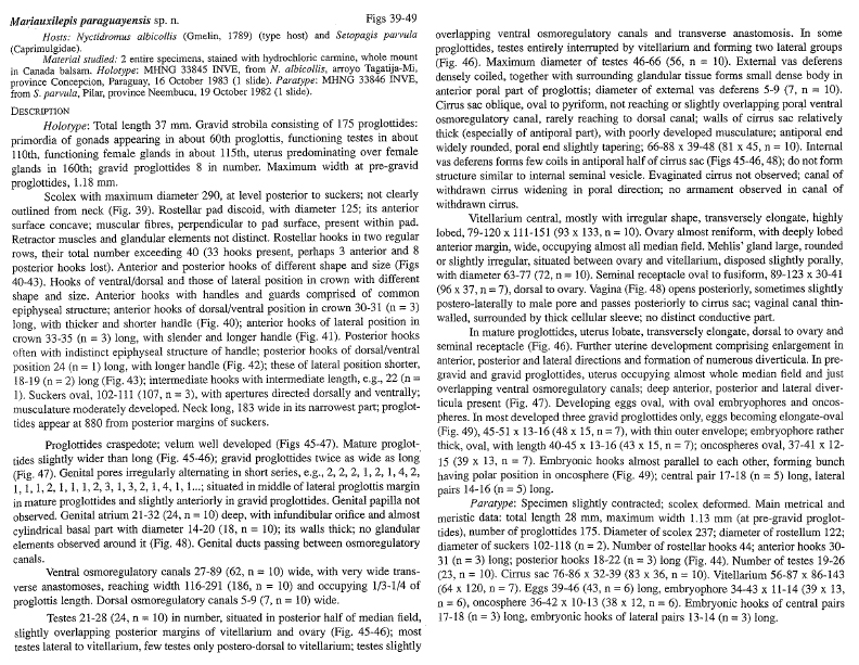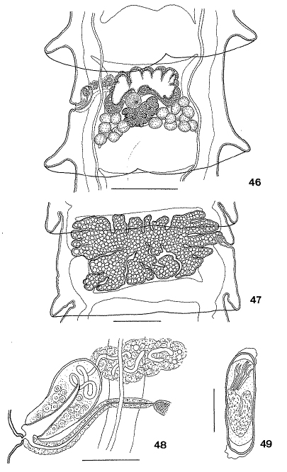Figs 46-49 Mariauxilepis paraguyayensis gen. n., sp. n., specimen from Nyctidromus albicollis (holotype): 46, mature proglottis showing an early stage of the uterine development, dorsal view; 47, pre-... MoreFigs 46-49 Mariauxilepis paraguyayensis gen. n., sp. n., specimen from Nyctidromus albicollis (holotype): 46, mature proglottis showing an early stage of the uterine development, dorsal view; 47, pre-gravid proglottis; 48, genital ducts, dorsal view; 49, egg. Scale bars: 46-47 = 250µm; 48 = 50µm; 49 = 20µm. |