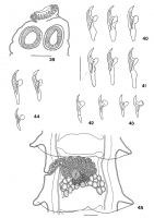 Figs 39-45 Mariauxilepis paraguayensis gen. n., sp. n., holotype (from Nyctidromus albicollis) and a paratype (from Setopagis parvula): 39, scolex of the holotype; 40-43, rostellar hooks of the holoty... MoreFigs 39-45 Mariauxilepis paraguayensis gen. n., sp. n., holotype (from Nyctidromus albicollis) and a paratype (from Setopagis parvula): 39, scolex of the holotype; 40-43, rostellar hooks of the holotype: 40, anterior rostellar hooks with ventral or dorsal position in the crown; 41, anterior rostellar hooks with lateral position in the crown; 42, posterior rostellar hook with dorsal (or ventral) position (left) and rather intermediate position (right) in the crown; 43, posterior rostellar hooks with lateral position in the crown; 44, rostellar hooks of the paratype; 45, mature proglottis, dorsal view, holotype. Scale bars: 39, 45 = 100µm; 40-44 = 20µm. |