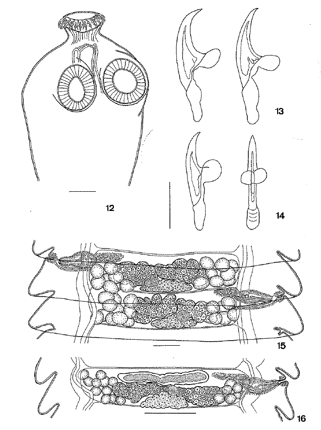 Figs 12-16 Metadilepis kornyushini sp. n.: 12, scolex; 13, anterior rostellar hooks; 14, posterior rostellar hooks; 15, mature proglottides, dorsal view; 16, mature proglottis showing an early stage of uterine development, dorsal view. Scale bars: 12, 15 = 100µm; 13-14 = 20µm; 16 = 250µm.