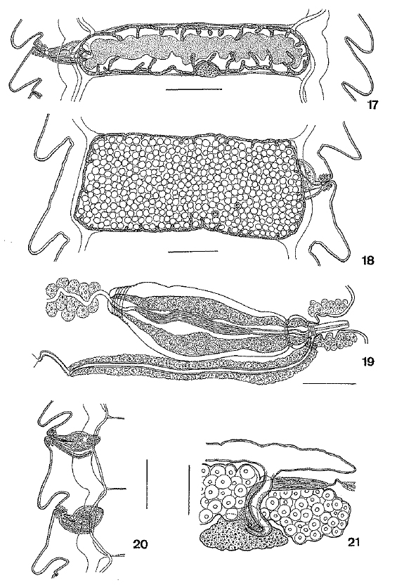 Figs. 17-21 Metadilepis kornyushini sp. n.: 17, pre-gravid proglottis; 18, gravid proglottis; 19, genital ducts in post-mature proglottis; 20, detail of genital ducts in two adjacent gravid proglottides showing different functional conditions of the internal vas deferens; 21, detail of the female genital system, dorsal view. Scale bars: 17-18, 20 = 250µm; 19 = 50µm; 21 = 100µm.