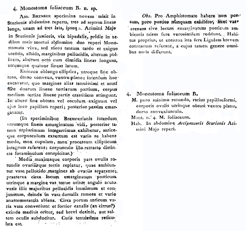 Rudolphi, C. A. 1819. Entozoorum synopsis, cui accedunt mantissa duplex et indices locupletissimi. Sumtibus Augusti Rücker, Berolini (Berlin), 811 pp. (14) Download PDFWagener, G. R. 1858. Enthelminthica No. V. Ueber Amphilina foliacea mihi (Monostoma foliaceum Rud.), Gyrocotyle Diesing und Amphiptyches Gr. W. . Archiv fur Naturgeschichte 24: 244-249. (1) Download PDF |