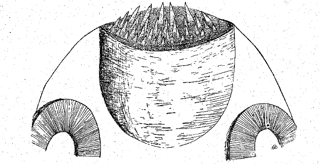 Contracted scolex, showing four rows of hooks.