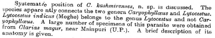 Mehra, H.R.. 1930. On a new species of Caryophyllaeus O. F. Müller from Kashmir with remarks on Lytocestus indicus (Moghe) 1925. In , , 247 pp.