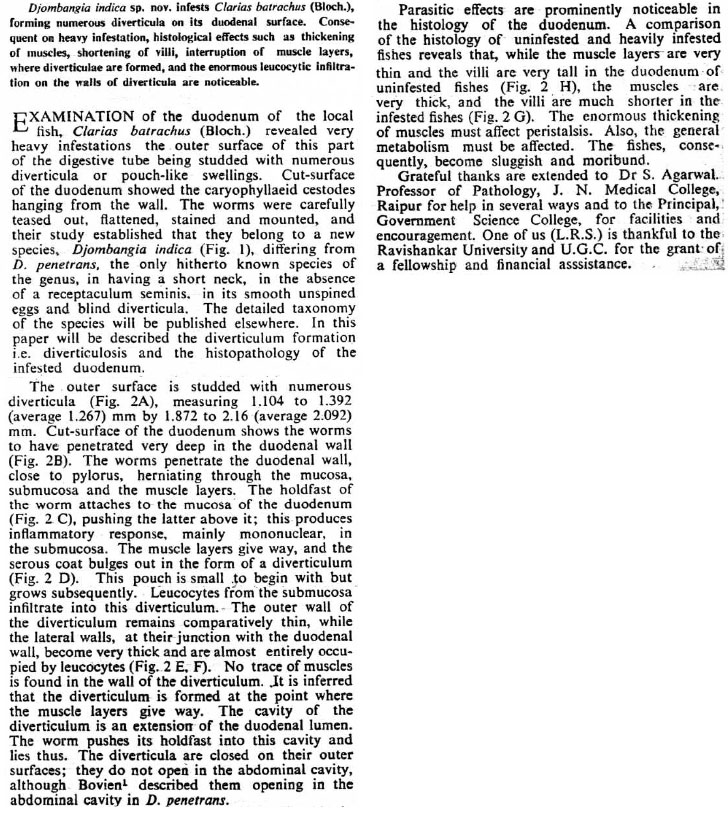 Satpute, L. R. and Agarwal, S. M. 1974. ‘Diverticulosis’ of the fish duodenum infested with cestodes. Indian Journal of Experimental Biology 12(4): 373-375. (722) Download PDFAsh A., T. Scholz, M. Oros, and P. K. Kar. 2011. Tapeworms (Cestoda: Caryophyllidea), parasites of Clarias batrachus (Pisces: Siluriformes) in the Indomalayan Region. Journal of Parasitology 97(3): 435-459. (5944) Download PDF |