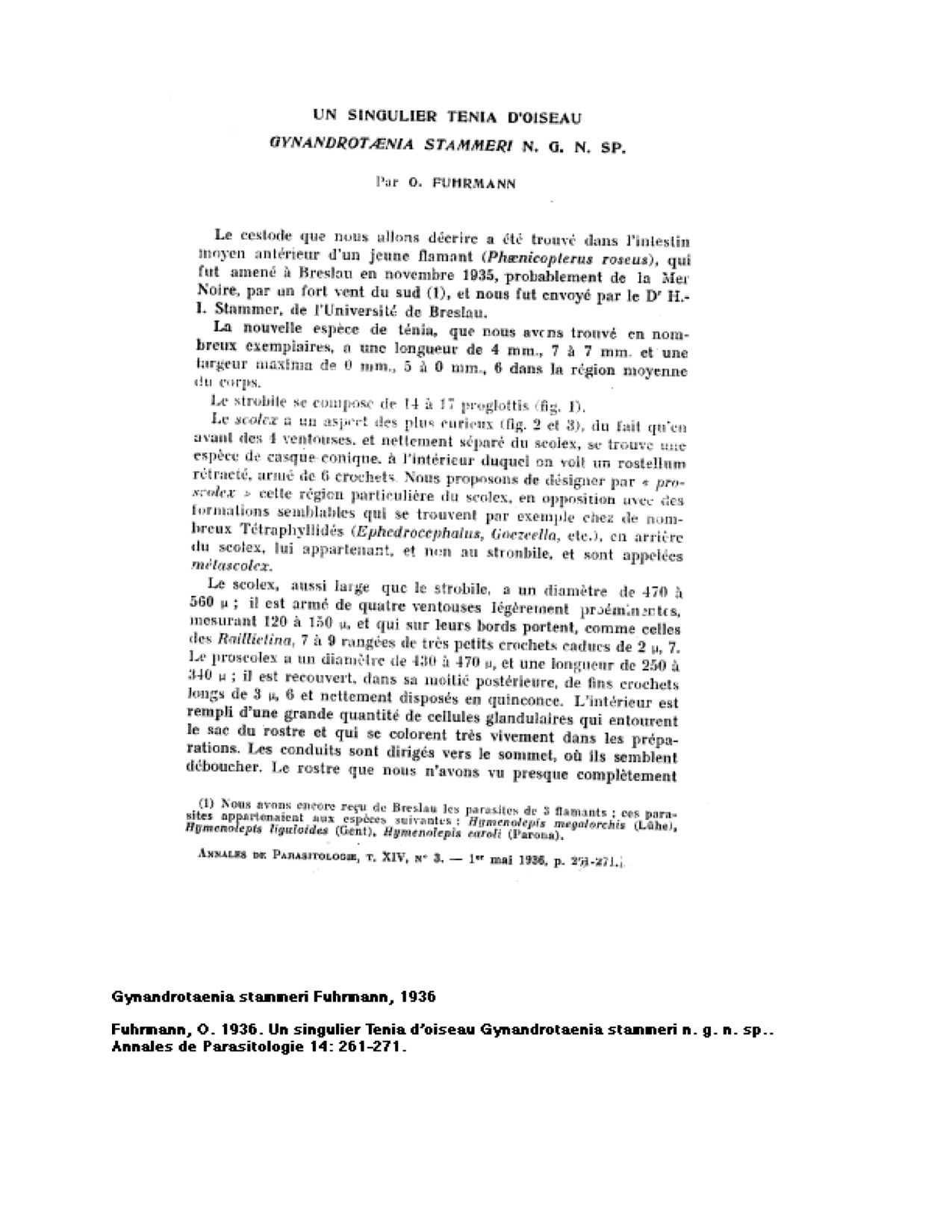 Fuhrmann, O. 1936. Gynandrotaenia stammeri nov. gen., nov. spec. Revue Suisse de Zoologie 43(3): 517-518. (6796) Download PDF |
