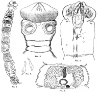 Fig. 1. Strobile de Gynandrotaenai stammeri. Fig. 2. Scolex avec proscolex et rostre rétracté. Fig. 3. Coupe longitudinale du scolex montranat les glandes du proscolex ainsi que la structure du rostre et du sac du rostre, qui contient des vaisseaux excréteurs. Fig. 4. Crochets du rostre. Fig. 5a. Crochet du cirre. Fig. 5. [sic] Extrémité postérieure d’un strobile. Segment male montrant les testicules en dégénérescence, le canal eéf´´rent et la poche du cirre avec les glandes prostatiques; le cirre en partie d´´vagin´´. Le dernier proglottis est un proglottis femelle st´´rile avec les ´´bauches de l’ovaire et de l’utérus. Fig. 6. Coupe horizontale du proglottis femelle mûr, montrant l’ovaire, le réceptacle séminal et en avant le jeune utérus médian.