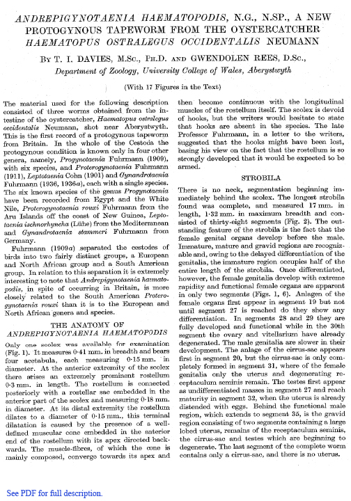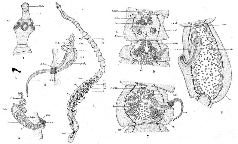 Figs. 1-5. Andrepigynotaenia haematopodis, n.g., n.sp. Fig. 1. Scolex. Fig. 2. Complete strobila, showing the female genitalia developing before the male. Fig. 3. Cirrus-sac and invaginated cirrus. Fi... MoreFigs. 1-5. Andrepigynotaenia haematopodis, n.g., n.sp. Fig. 1. Scolex. Fig. 2. Complete strobila, showing the female genitalia developing before the male. Fig. 3. Cirrus-sac and invaginated cirrus. Fig. 4. Cirrus-sac and evaginated cirrus. Fig. 5. One of the hooks of the cirrus. Figs. 6-8. Andrepigynotaenia haematopodis, n.g., n.sp. Fig. 6. Two adjacent proglottides, showing functional female genitalia. Dorsal view. Fig. 7. Proglottis, showing functional male organs, gravid uterus and remains of receptaculum seminis. Dorsal view. Fig. 8. Gravid proglottis containing uterus, cirrus-sac, degenerating testes and receptaculum seminis. Dorsal view. |