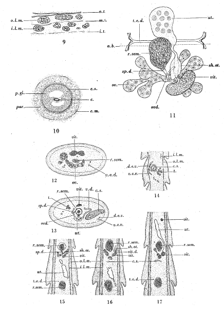 ducts, and developing cirrus passing dorsally to both lateral excretory vessels. Fig. 14, Sagittal section, showing cirrus-sac dorsal to excretory vessels. Fig. 15. Sagittal section, showing junction of sperm-duct with oviduct, etc. Fig. 16. Sagittal section, showing vitellarium, vitelline duct, etc. Fig. 17. Sagittal section, showing course of uterus from ootype to segment next in front. |