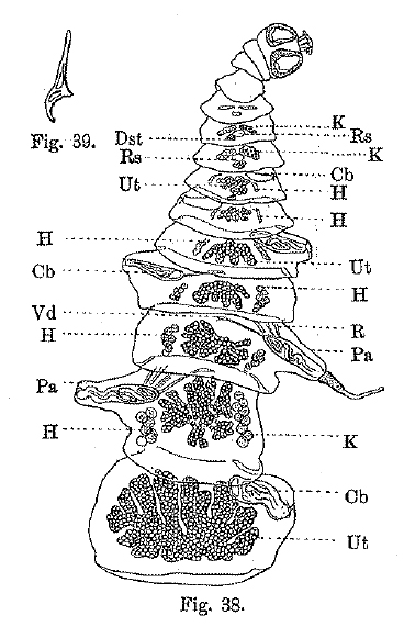 Fig. 38. Progynotaenia fuhrmanni nov. sp. Totalbild der ganzen Strobila. K Keimstock; Dst Dotterstock; Rs Receptaculum seminis; Cb Cirrusbeutel; H Hoden; Ut Uterus; Vd Vas deferens; R Retractor des Cirrusbeutels; Pa Genitalpapille. Fig. 39. Progynotaenia fuhrmanni n. sp. Haken des Rostellums.