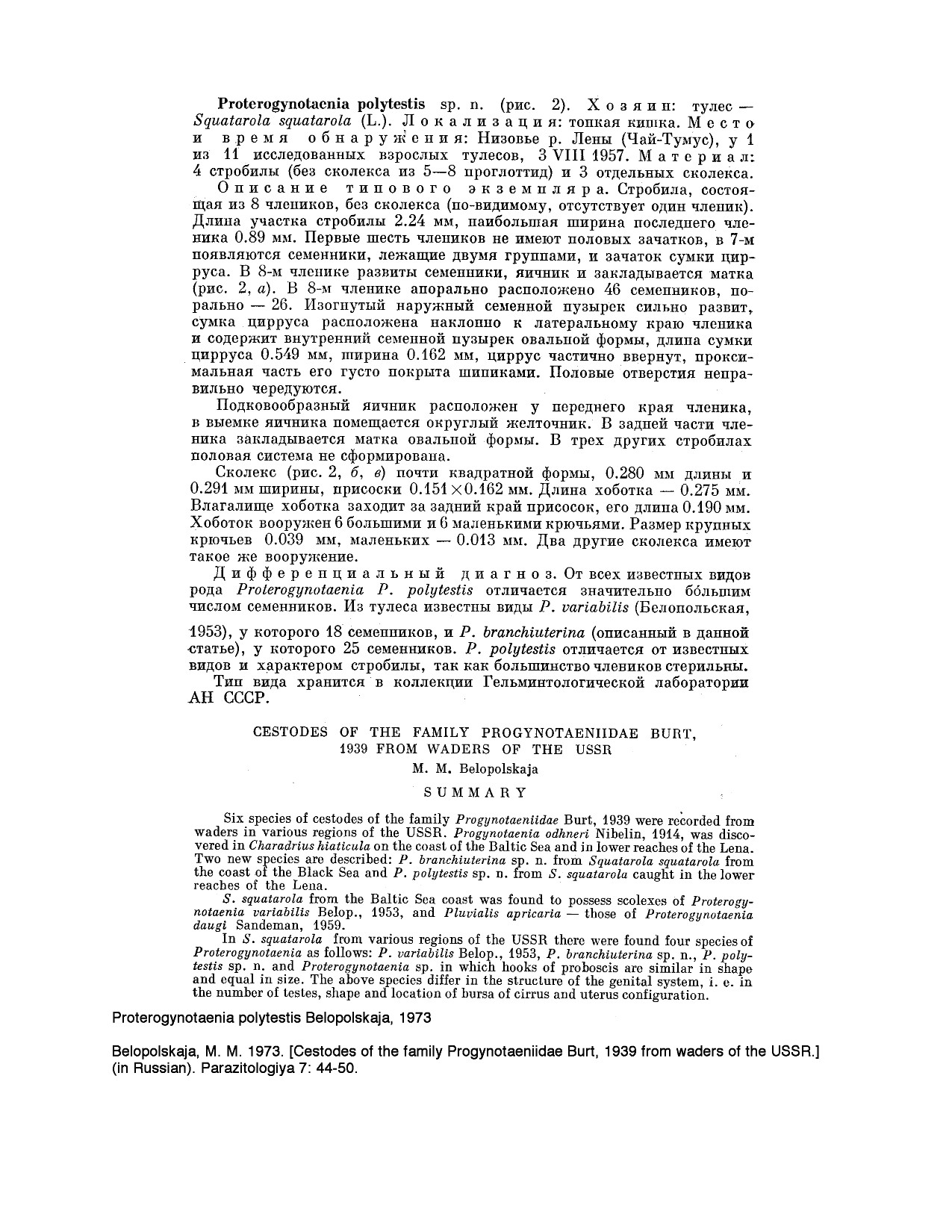 Belopolskaya, M. M. 1973. [Cestodes of the family Progenotaeniidae Burt, 1939 from wardes of the USSR] (in Russian). Parazitologiya 7(1): 44-50. (6626) Download PDF |