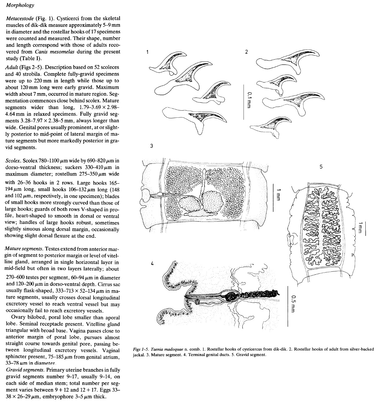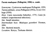 Pellegrini, D. 1950. Una nuova specie di larva di tenia (Cysticercus madoquae) nel dig-dig. Rivista di Parassitologia 11: 21--217. (5719) Download PDFJones, A., B. A. Allsopp, C.N.L. Macpherson, and M.T.E.P. Allsopp. 1988. The identity, life-cycle and isoenzyme characteristics of Taenia madoquae (Pellegrini, 1950) n. comb. from silver-backed jackal (Canis mesomelas Schreber, 1775) in East Africa. Systematic Parasitology 11: 31-38. (5720) Download PDF |