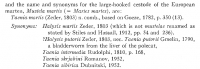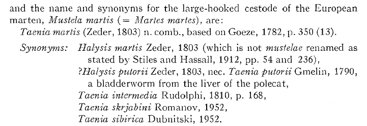 Synonyms Halysis martis Zeder, 1803; Fimbriotaenia martis (Zeder, 1803) Kornyushin & Sharpilo, 1986; Taenia intermedia Rudolphi, 1810; Taenia sibirica Dubnitzkii, 1952; Taenia skrjabini Romanov, 1952
