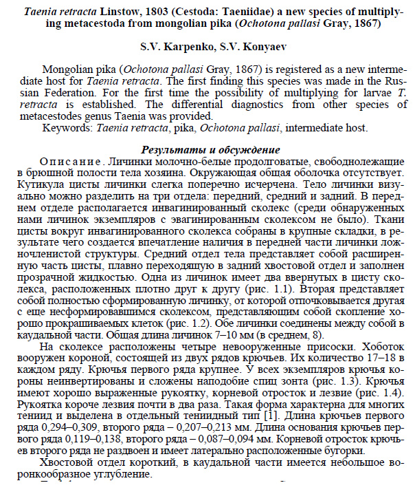 Karpenko, S, V, and S. Konyaev. 2012. [Taenia retracta Linstow, 1803 [sic.] (Cestoda: Taeniidae) - a new species of multiplying metacestoda from Mongolian pika (Ochotona pallasi Gray, 1867)]. Rossiiskii Parazitologicheskii Zhurnal 2012: 11-15.