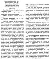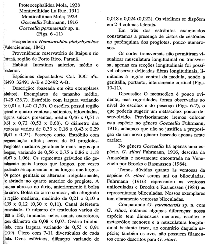 Pavanelli, G. C. and A. A. Rego. 1989. Novas espécies de proteocefalídeos (Cestoda) de Hemisorubim platyrhynchos (Pisces-Pimelodidae) do estado do Paraná. Revista Brasileira de Biologia 49: 381-386. (4168) Download PDFAlves, P., V. A. de Chambrier, J. L. Luque and T. Scholz. 2017. Reappraisal of Goezeella Fuhrmann, 1916 (Cestoda: Proteocephalidae), parasites of Neotropical catfishes (Siluriformes), with description of a new species from Pimelodella cristata (Heptapteridae). Revue suisse de Zoologie 124(2): 355-350. (7114) Download PDF |