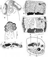 Goezeella paranaensis sp. n.: Fig. 6 - Escólex; Fig. 7. - Escólex, ventosas salientes; Fig. 8 - Proglote maduro; Fig. 9 - Proglote grávido - C = cisto de cestóide hiperparasita; Fig. 10 - Corte transversal de proglote maduro - T = testítulos; OV = ovário; FV = folículos vitelínicos; UT = útero em formação; Fig. 11 - Corte lateral de segmento - FV = folículos vitelínicos; T = testícuos; OV = ovário; FL = fibras longitudinais.