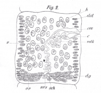 Fig. 2. Ichthyotaenia abscisa n. sp. Geschlechtsreife Proglottis, der Uterus ist weggelassen. ove, obere Vaginerweiterung; v, Vagina; wrs, wahres Receptaculum seminis; sch, Schalendrüse; dst, Dotterstock; dg, Dottergang; ov, Ovarium; c, Cirrus; vdk, Knäuel des Vas deferens; h, Hodenbläschen.