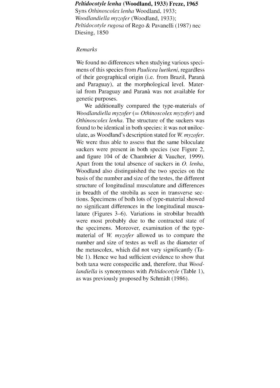 | Scientific Name Notes | Zehnder & de Chambrier synonymized Woodlandiella myzofera with Peltidocotyle lenha; thus, supressing the genus Woodlandiella; Woodland lists the combination P. lenha in Cit# 5470 referring to Cit# 3961 for the Authority but B. Barbeau could not find that name in that citation. |