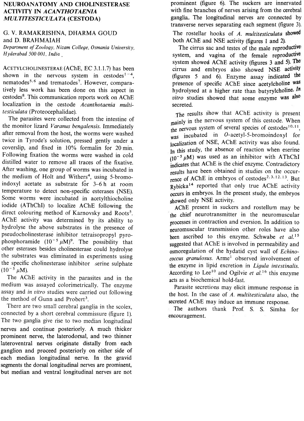 Ramakrishna, G. V., D. Goud and D. Brahmaiah. 1989. Neuroanatomy and cholinesterase activity in Acanthotaenia multitesticulata (Cestoda). Current Science 58(21): 1205-1207. (4141) Download PDF |