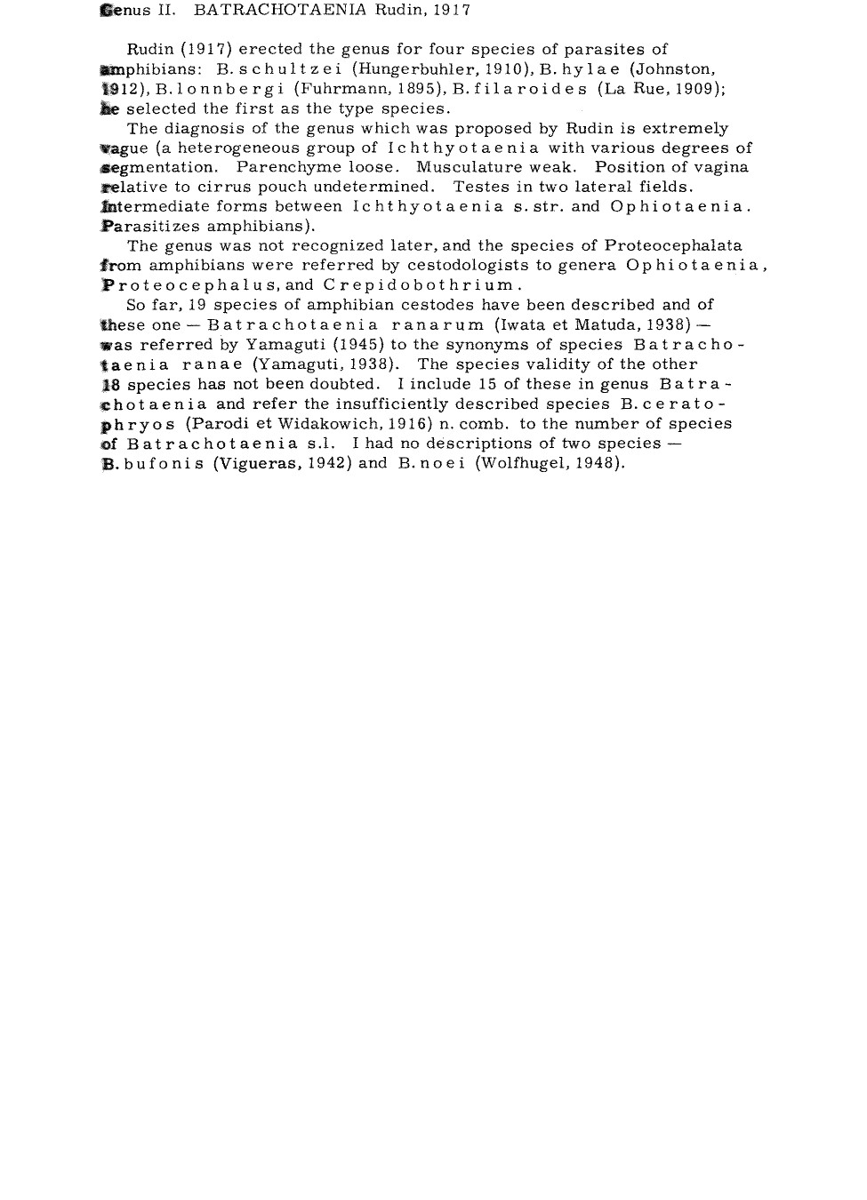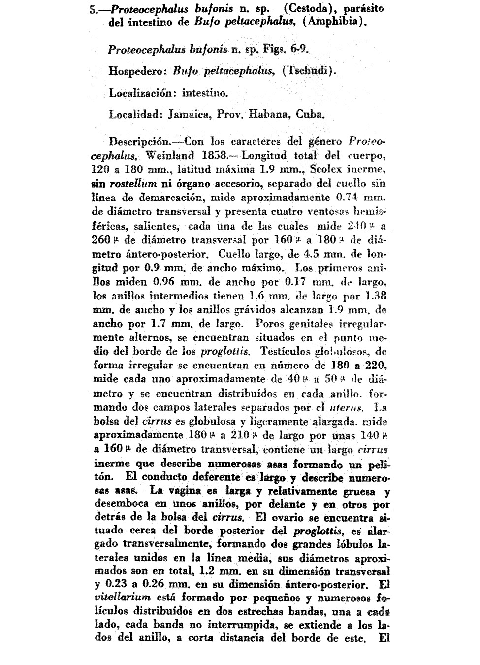 Vigueras, P. I. 1942. 5. Proteocephalus bufonis n. sp. (Cestoda), parasite del intestino de Bufo peltacephalus, (Amphibia). Notas Helmintologicas No. 5: 208-209 & 220-221. (3994)Freze, V. I. 1965. [Proteocephalata in Fish, Amphibians, and Reptiles] (In Russian). Osnovy Tsestodologii 5: 538 pp. (4031) Download PDF |