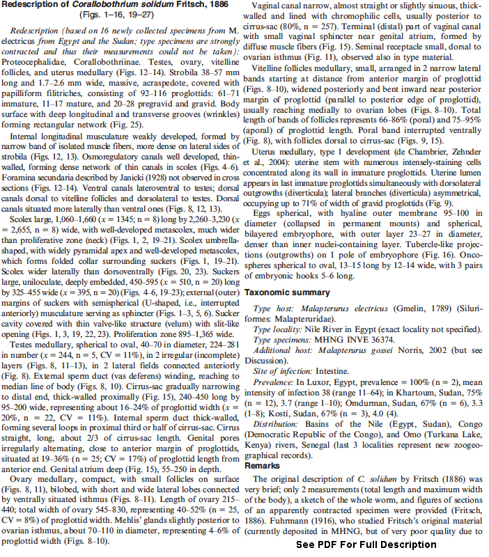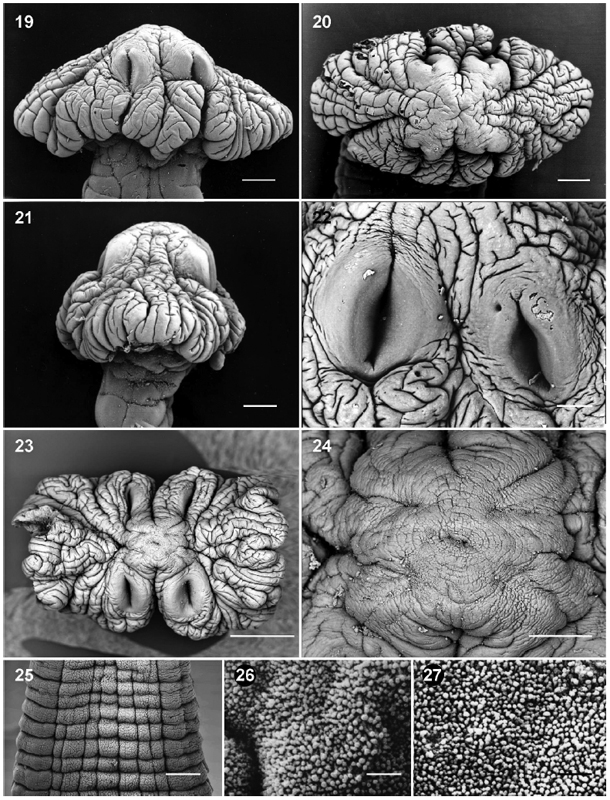 Figures 19-27. Scanning electron micrographs. 19-22, 25-27. Corallobothrium solidum Fritsch, 1886 from Malapterurus electricus, Egypt (19-21) Dorsoventral, apical, and lateral view, respectively (MHNG... MoreFigures 19-27. Scanning electron micrographs. 19-22, 25-27. Corallobothrium solidum Fritsch, 1886 from Malapterurus electricus, Egypt (19-21) Dorsoventral, apical, and lateral view, respectively (MHNG INVE 32762). (22) Detail of suckers (MHNG INVE 32763). (23, 24) Apical view of scolex and detail of the apical region, respectively. (25) C. solidum from M. electricus, Egypt (MHNG INVE 32762). Longitudinal and transverse grooves on the strobila. (26, 27) Papilliform filitriches on suckers and apex of the scolex, respectively (MHNG INVE 32763). 23, 24. Corallobothrium cf. solidum Fritsch, 1886, from Malapterurus gossei, Democratic Republic of the Congo (MHNG INVE 63057). Scale bars: 19-21, 25 = 200 µm; 22 = 100 µm; 24 = 250 µm; 26, 27 = 2 µm. |