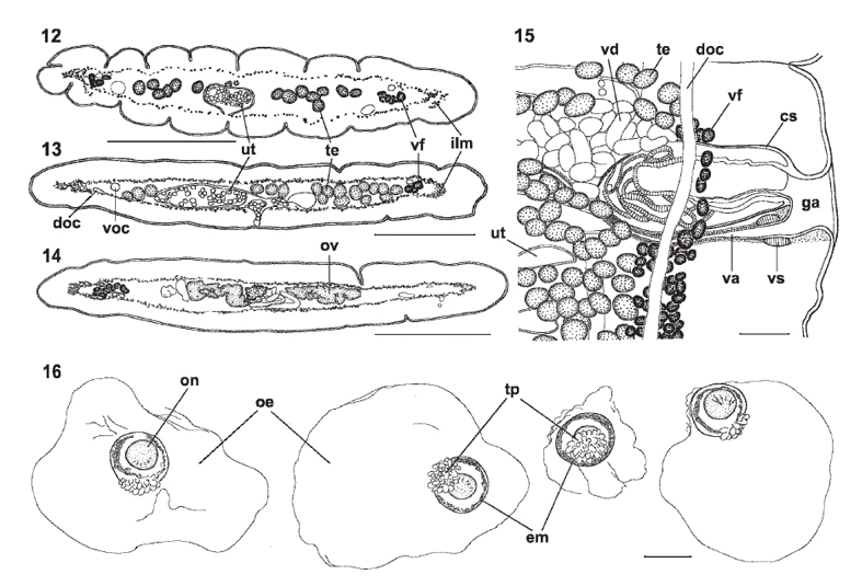 Figures 12-18. (12-16) Corallobothrium solidum Fritsch, 1886 from Malapterurus electricus. (12-14) Cross sections of pregravid proglottid at level of anterior, middle, and posterior part, respectively... MoreFigures 12-18. (12-16) Corallobothrium solidum Fritsch, 1886 from Malapterurus electricus. (12-14) Cross sections of pregravid proglottid at level of anterior, middle, and posterior part, respectively (MHNG INVE 32762 and 32763), Egypt. (15) Terminal genitalia, dorsal view (MHNG INVE 63197), Sudan. (16) Eggs in distilled water (MHNG INVE 48053), Sudan. Abbreviations: cs, cirrus-sac; doc, dorsal osmoregulatory canal; em, bilayered embryophore; ga, genital atrium; ilm, longitudinal internal musculature; oe, outer envelope; on, oncospheres; ov, ovary; te, testes; tp, tubercule-like projections; ut, uterus; va, vagina; vd, vas deferens; vf, vitelline follicles; voc, ventral osmoregulatory canal; vs, vaginal sphincter. Scale bars: 12-14 = 500 µm; 15 = 100 µm; 16-18 = 20 µm. |
