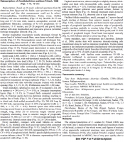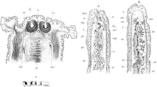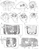 Figures 1-11. Corallobothrium solidum Fritsch, 1886, from Malapterurus electricus. (1, 2) Dorsoventral view of scolex (1, MHNG INVE 31550; 2, MHNG INVE 31554), Egypt. (3) Detail of sucker showing the ... MoreFigures 1-11. Corallobothrium solidum Fritsch, 1886, from Malapterurus electricus. (1, 2) Dorsoventral view of scolex (1, MHNG INVE 31550; 2, MHNG INVE 31554), Egypt. (3) Detail of sucker showing the spincter (MHNG INVE 63109), Egypt. (4-6) Sagittal sections of scolex (MHNG INVE 32761), Egypt. Note the dense network of osmoregulatory canals in the apical region. (7) Scolex of juvenile specimen (MHNG INVE 33997), Egypt. (8) Mature proglottid, ventral view *MHNG INVE 32762), Egypt. (9) Gravid proglottid, testes omitted, dorsal view (MHNG INVE 63197), Sudan. (10) Pregravid proglottid, with cirrus everted, dorsal view (MHNG INVE 31554). (11) Detail of the posterior region of a pregravid proglottid, dorsal view (MHNG INVE 31554), Egypt. Abbreviations: ad, additional opening; ao, apical organ; mg, Mehlis' gland; ms, metascolex; oc, osmoregulatory canals; ov, ovary; sp, circular musculature serving as sphincter; sr, seminal receptacle. Scale bars: 1, 11 = 200 µm; 2 = 1,000 µm; 4-6, 9-10 = 500 µm; 8 = 300 µm. |