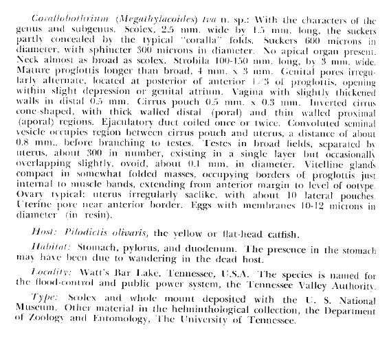 Scientific Name Notes -the name Corallobothrium (Megathylacoides) tva was proposed by Jones, Kerley, & Sneed, 1956. The genus Megathylacoides is now recognized as valid (see Freze, 1965. )