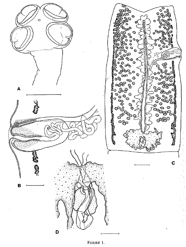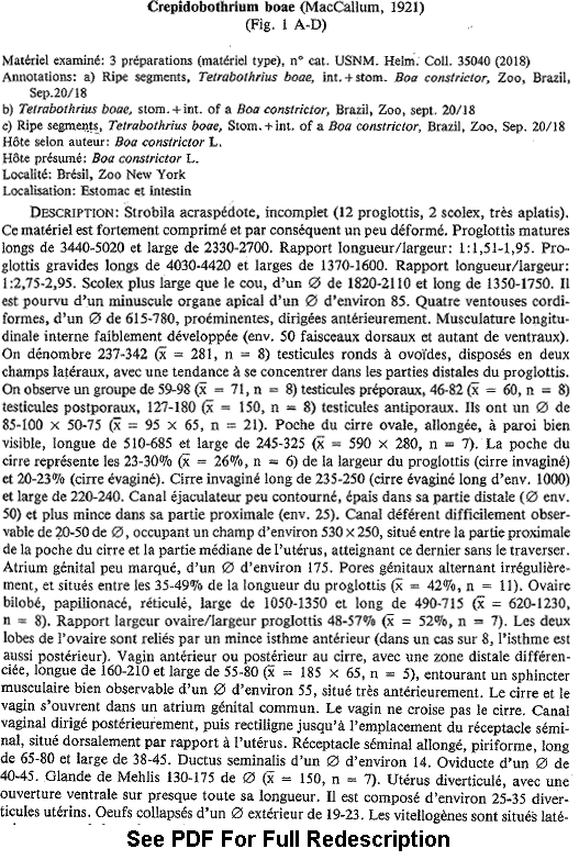 de Chambrier, A. 1989. Révision du genre Crepidobothrium (Monticelli, 1900) (Cestoda: Proteocephalidea) parasite d’Ophidiens néotropicaux. I. C. gerrardii (Baird, 1860) et C. viperis (Beddard, 1913). Revue Suisse de Zoologie 96(1): 191-217.