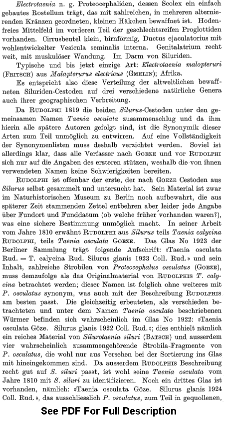 de Chambrier, A., T. Scholz, and M. H. Ibraheem. 2004. Redescription of Electrotaenia malopterurui (Fritsch, 1886) (Cestoda: Proteocephalidae), a parasite of Malapterurus electricus (Siluriformes: Malapteruruidae) from Egypt. Systematic Parasitology 57: 97-109.