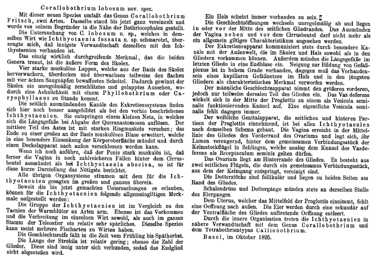 Riggenbach, E. 1895. Beiträge zur Kenntnis der Taenien der Süsswasserfische. Centralblatt für Bakteriologie und Parasitenkunde, Abteilung I 18: 609-613 + plate .