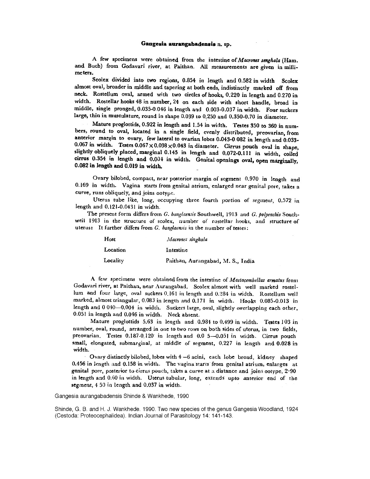 Shinde, G. B. and H. J. Wankhede. 1990. Two new species of the genus Gangesia Woodland, 1924 (Cestoda: Proteocephalidea). Indian Journal of Parasitology 14: 141-143. (4068) Download PDF |