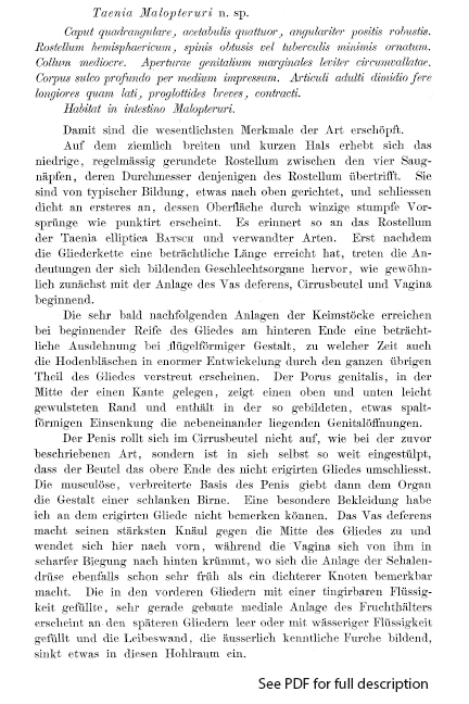 Fritsch, G. 1886. Die Parasiten des Zitterwelses. Sitzungsberichte der Königlich Preussischen Akademie der Wissenschaften zu Berlin, Sitzung der physikalisch-mathematischen Classe 6: 99-108 + plate I. (4123) Download PDFRiggenbach, E. 1896. Das Genus Ichthyotaenia. Revue Suisse de Zoologie 4: 165-275 + Plates. (4109) Download PDF |