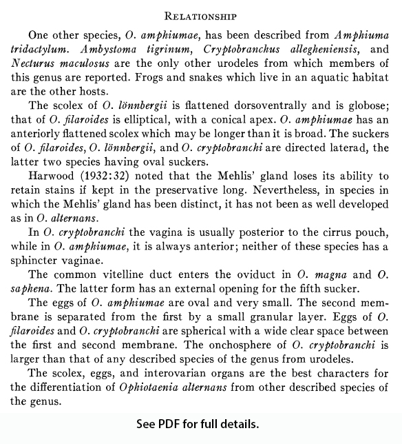 Zeliff, C. C. 1932. A new species of cestode Crepidobothrium amphiumae from Amphiuma tridactylum. Proceedings of the United States National Museum 81: 1-3 + Plate 1. (3989) Download PDFRiser, N. W. 1942. A new proteocephalid from Amphiuma tridactylum Cuvier. Transactions of the American Microscopical Society 61: 391-397. (4053) Download PDF |