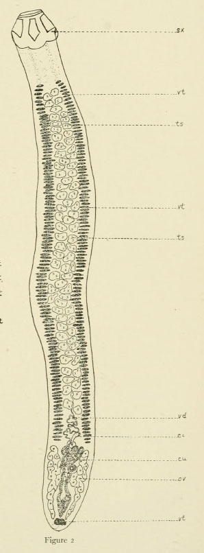 Fig. 2. - Carophyllaeus laruei: adult seen from ventral surface ci, cirrus sac; cu, coiled uterus; ov, ovary; sx, scolex; ts, testes; vd, vas deferens; vt, vitelline glands.
