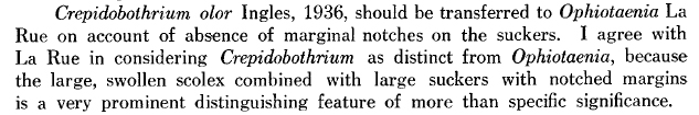 | Synonyms | -Crepidobothrium olor Ingles, 1936 -Batrachotaenia olor (Ingles, 1936) Freze, 1965 -Proteocephalus olor (Ingles, 1936) Brooks, 1 |