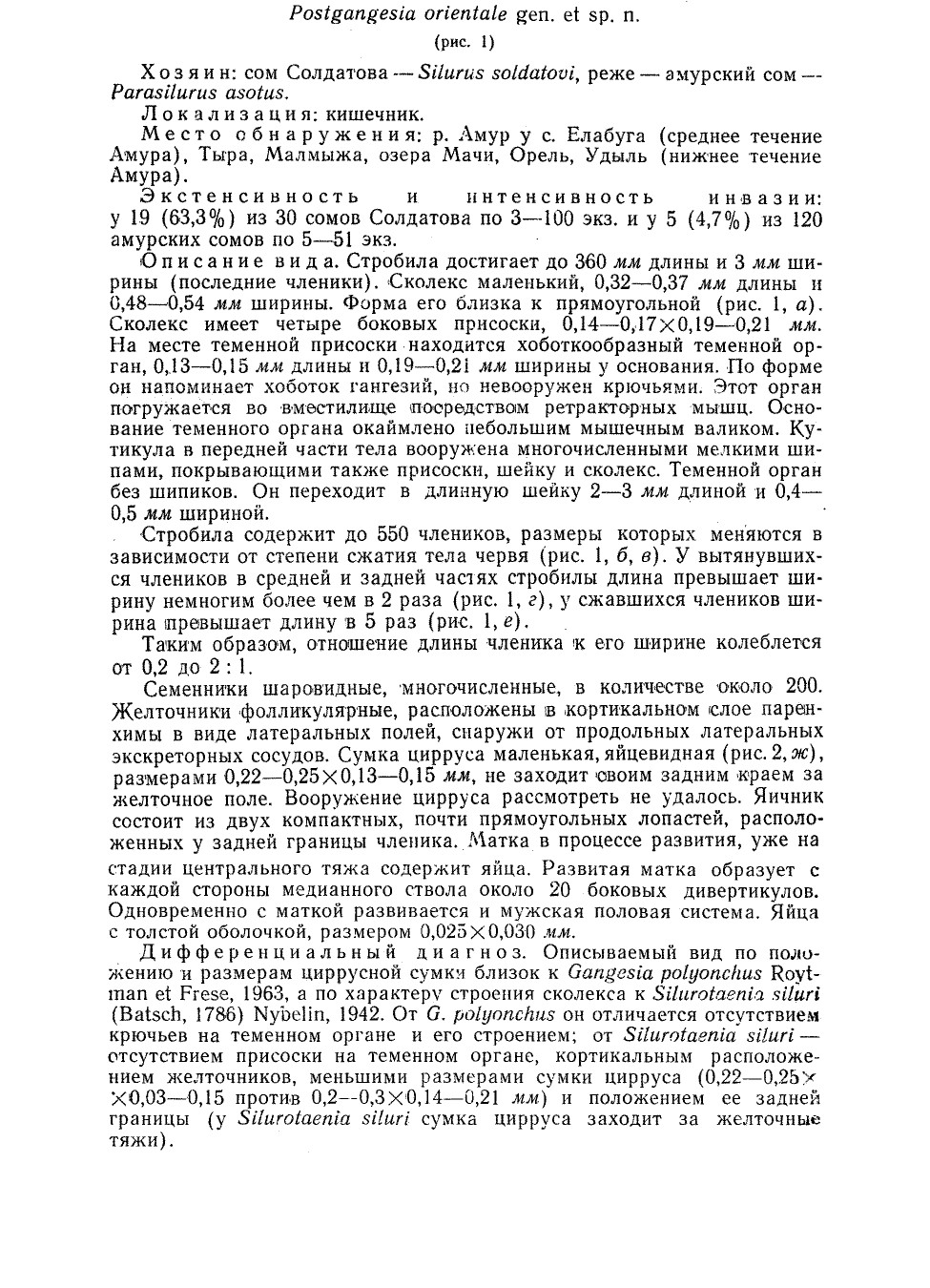 Akhmerov, A. Kh . 1969. New cestode Postgangesia orientale g. et sp. n. belonging to the new subfamily Postgangesiinae (Cestoda: Proteocephalidae) from silurid fishes of the River Amur [In Russian]. Trudy Gel’mintologicheskoi Laboratorii. Akademiya Nauk SSSR 20: 3-7. (4153) Download PDFde Chambrier, A. , S. N. H. Al-Kallak, & J. Mariaux. 2003. A new tapeworm, Postgangesia inarmata n. sp. (Eucestoda: Proteocephalidea: Gangesiinae), parasitic in Silurus glanis (Siluriformes) from Iraq and some comments on the Gangesiinae Mola, 1929. Systematic Parasitology 55: 199-209. (4063) Download PDF |
