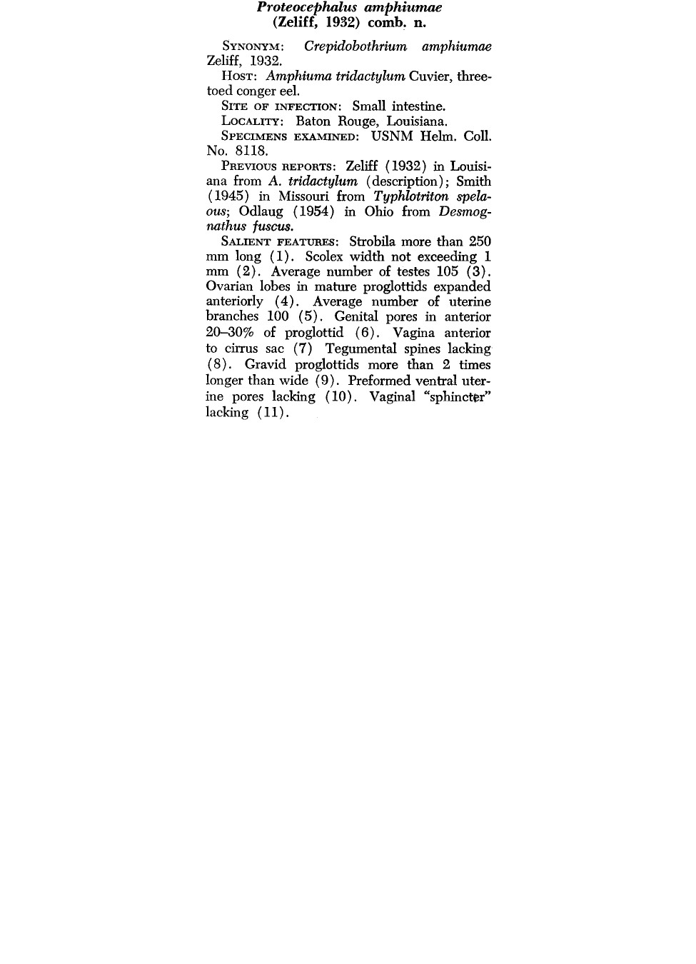 Zeliff, C. C. 1932. A new species of cestode Crepidobothrium amphiumae from Amphiuma tridactylum. Proceedings of the United States National Museum 81: 1-3 + Plate 1. (3989) Download PDFBrooks, D. R. 1978. Systematic status of proteocephalid cestodes from reptiles and amphibians in North America with descriptions of three new species. Proceedings of the Helminthological Society of Washington 45: 1-28. (4154) Download PDF |