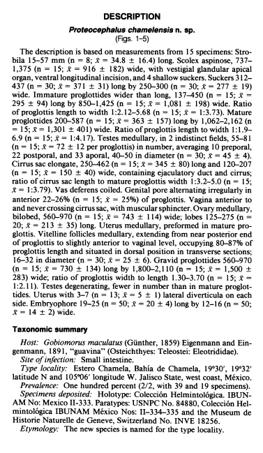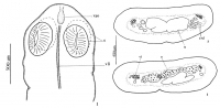 FIGURES 1-5. Drawings of Proteocephalus chamelensis n. sp. 1. Scolex. 2, 3. Cross sections of gravid proglottides showing the medullary position of vitelline follicles and testes. 4. Mature proglottis... MoreFIGURES 1-5. Drawings of Proteocephalus chamelensis n. sp. 1. Scolex. 2, 3. Cross sections of gravid proglottides showing the medullary position of vitelline follicles and testes. 4. Mature proglottis. 5. Gravid proglottis; cp, cirrus pouch; exd, excretory duct; eyd, ejaculatory duct; o, ovary; pu, preformed uterus; s, suckers; t, testes; u, uterus; v, vagina; vao, vestigial apical organ; vd, vas deferens; vi, vitellaria; vli, ventral longitudinal incision |