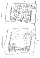 FIGURES 4-5. Drawings of Proteocephalus chamelensis n. sp. 4. Mature proglottis. 5. Gravid proglottis; cp, cirrus pouch; exd, excretory duct; eyd, ejaculatory duct; o, ovary; pu, preformed uterus; s, ... MoreFIGURES 4-5. Drawings of Proteocephalus chamelensis n. sp. 4. Mature proglottis. 5. Gravid proglottis; cp, cirrus pouch; exd, excretory duct; eyd, ejaculatory duct; o, ovary; pu, preformed uterus; s, suckers; t, testes; u, uterus; v, vagina; vao, vestigial apical organ; vd, vas deferens; vi, vitellaria; vli, ventral longitudinal incision |