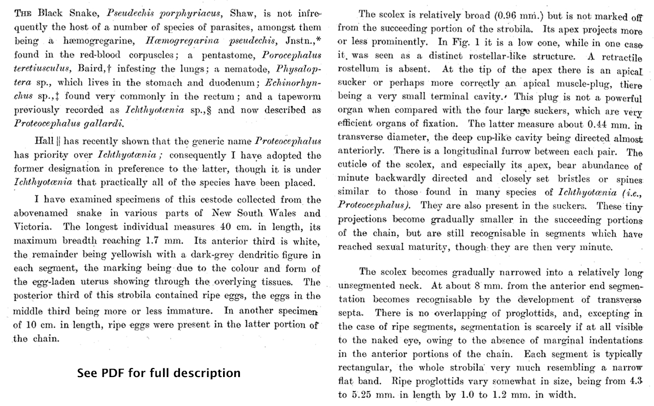 Johnston, T. H. 1911. Proteocephaus gallardi. A new cestode from the black snake. Annals of the Queensland Museum 10: 175-182. (4099) Download PDF |