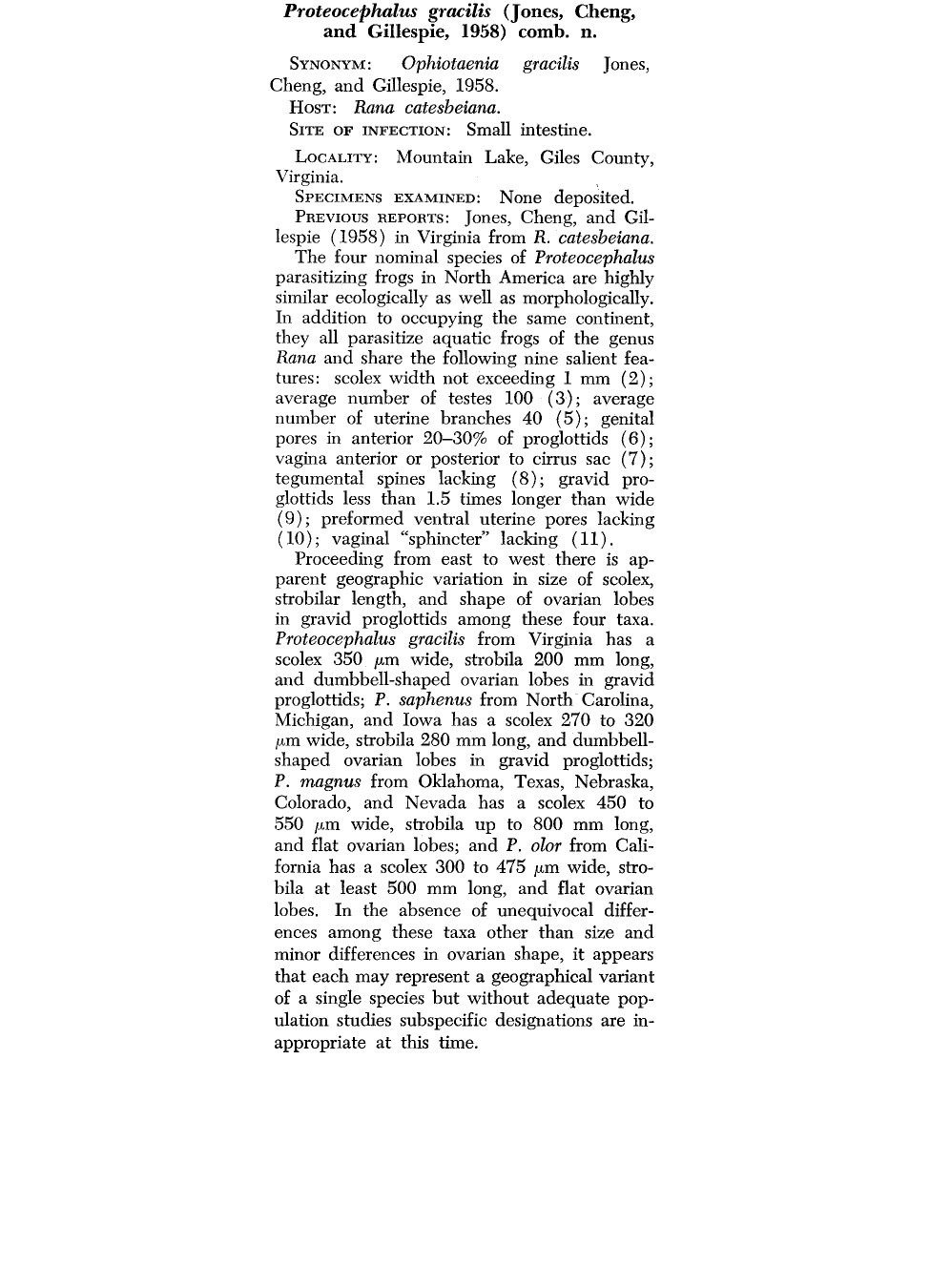 Jones, A. W., T. C. Cheng, and R. F. Gillespie. 1958. Ophiotaenia gracilis n. sp., a proteocephalid cestode from a frog. Journal of the Tennessee Academy of Science 33: 84-88. (4001) Download PDFBrooks, D. R. 1978. Systematic status of proteocephalid cestodes from reptiles and amphibians in North America with descriptions of three new species. Proceedings of the Helminthological Society of Washington 45: 1-28. (4154) Download PDF |