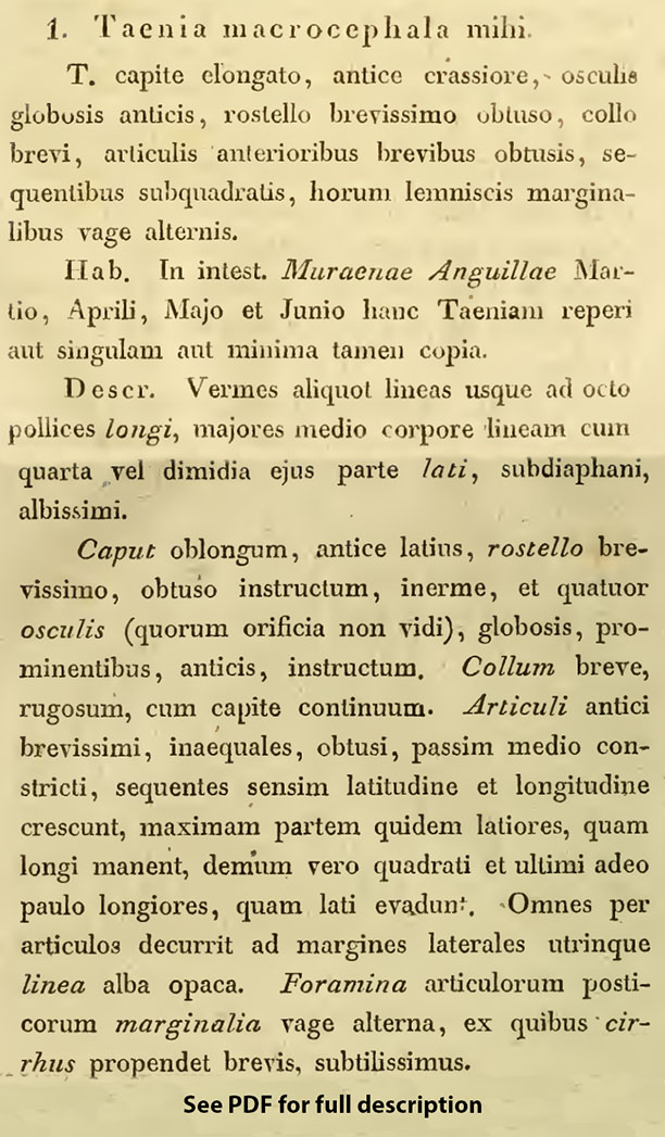 | Synonyms | Taenia macrocephala Creplin, 1825; T. hemisphaerica Molin, 1859; T. dilatata Linton, 1889; Proteocephalus dilatatus (Linton, 1889) La Rue, 1911 |