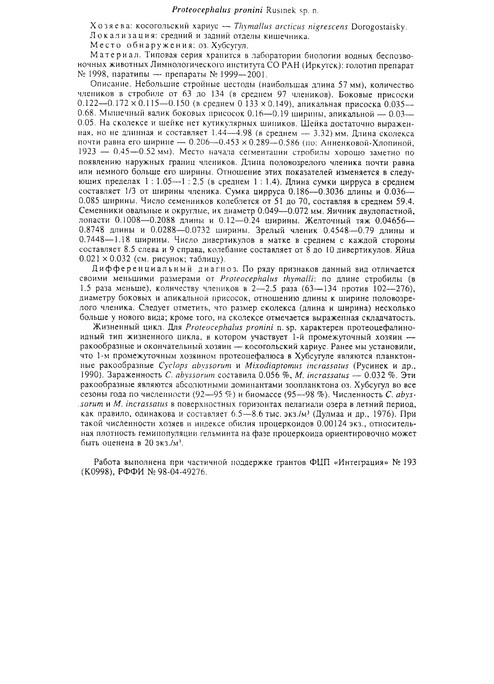 Rusinek, O. T. 2001. Description of Proteocephalus pronini sp. n. (Cestoda: Proteocephalidae) -- a parasite of the Lake Hovsgol grayling. Parazitologiya 35: 159-162.