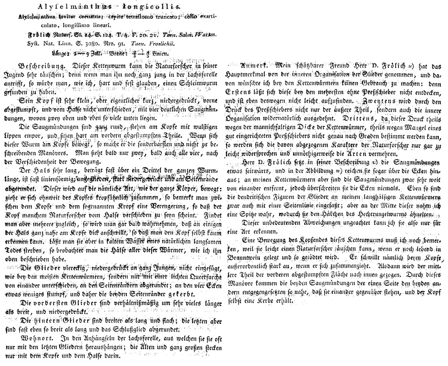 Zeder, J. G. H. 1800. Erster Nachtrag zur Naturgeschichte der Eingeweidewürmer von Johann August Ephraim Goeze. Crusius, Leipzig, 320 + 6 Kupferta pp.
